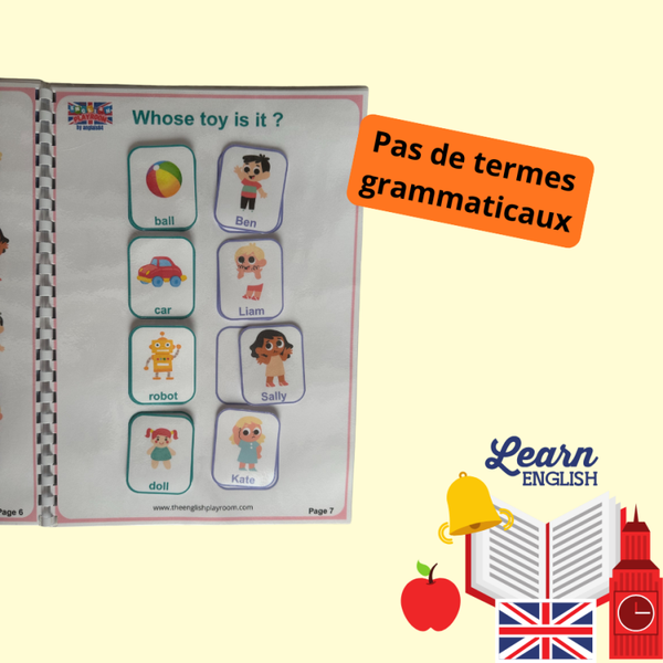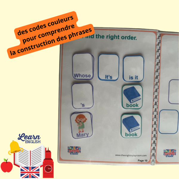 Cette méthode progressive (basée sur des couleurs et de la manipulation des vignettes de mots) familiarise l’enfant avec cette structure de phrase compliquée pour les francophones.